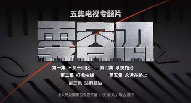 《零容忍》专题片共有五集,分别为《不负十四亿》、《打虎拍蝇》、《惩前毖后》、《系统施治》和《永远在路上》。通过公安部原副部长政治团伙案、国家开发银行原党委书记胡怀邦案、贵州省政协原党组书记、主席王富玉案,甘肃永登县低保办主任赵永琏侵害困难群众利益案、江苏仪征基层粮站贪腐案等典型案例,反映中国共产党秉持自我革命精神,各级纪检监察机关以零容忍态度惩治腐败,老虎苍蝇一起打。坚持党要管党、全面从严治党,坚定不移推进党风廉政建设和反腐败斗争,确保党和人民赋予的权力用来为人民谋幸福,让人民群众感受到全面从严治党就在身边、正风肃纪反腐就在身边、纪检监察就在身边。